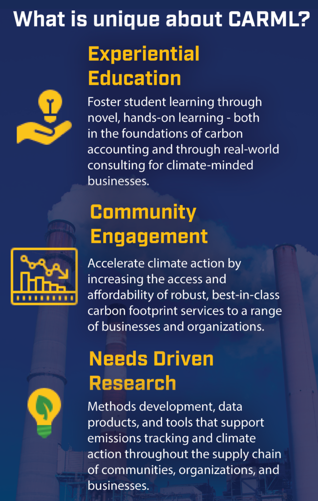 CARML’s mission is to foster and accelerate climate action leadership. We blend rigorous training in the fundamentals of carbon accounting with a hands-on experiential learning environment. Students sharpen their professional skills while providing affordable carbon accounting services to the community. By combining experiential education, community engagement, and needs driven research, CARML is helping to cultivate the next generation of climate leaders.
